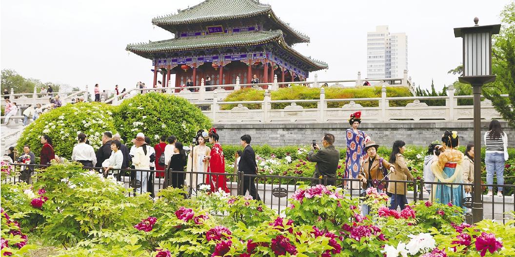 唯有牡丹真国色,花开时节动京城。4月15日,在西安市兴庆宫公园,沉香亭畔近万株牡丹进入盛开期,百余品种集中绽放,与园内唐风建筑相映成景,市民游客络绎不绝,游园赏花,拍照打卡,尽享春日美景。 巴新建 摄