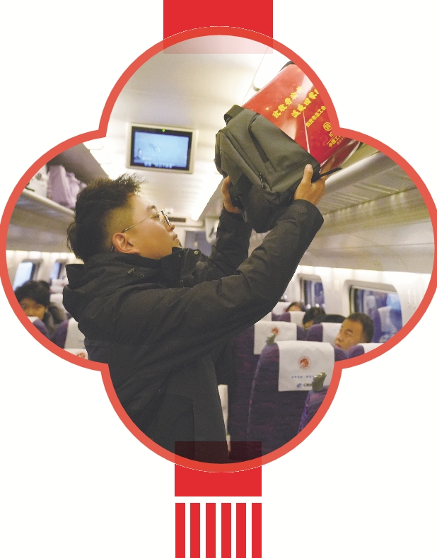 首次参加平安返乡活动的王师傅手里攥着春联、提着暖心礼包,眼中满是对归乡的热切期待。“听说车上一会还有专门的演出,唱唱跳跳的年味一下就有了。”王师傅登D1925次列车车厢,满眼皆是惊喜。