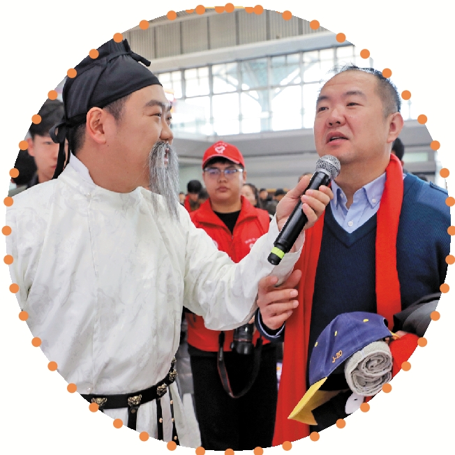 上午九时许,高铁站候车大厅内已是暖意融融、年味十足。主持人现场与旅客互动,“唐诗对答”“唐诗盲盒”让千年诗意温暖旅途。另一旁,“送万福 进万家”义写春联和非遗剪纸公益活动同步开展,书法家和非遗代表性传承人现场为大家送上新春祝福。来自先进制造、重点工程、现代物流、城市保供等领域的一线劳动者齐聚一堂,他们之中,既有坚守生产线多年的“老把式”,也有刚在快递、外卖行业奔跑了一年的新面孔;既有参与过城市地标建设的能工巧匠,也有守护万家灯火与网络畅通的技术骨干。此刻,他们褪去工装,带上行囊,火红的围巾与定制的大礼包,让此刻的他们从城市的建设者,变成了幸福的归家人。